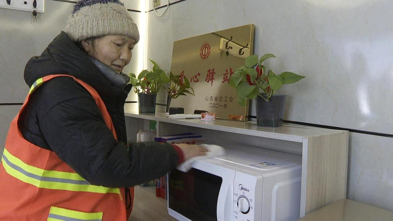走进广灵县政务大厅工会驿站,环卫工人恩德平一边搓着几乎冻僵的手一边走进暖意融融的驿站,打开冒着腾腾热气的暖水瓶倒了一杯热水,继续他一天的清扫工作。